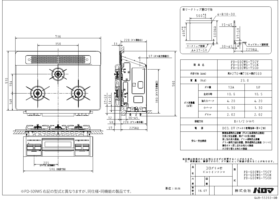 グリル機能 水なし両面焼グリル ラクック対応 ※別売オプション コーティング焼き網(メッキ) 遠赤外線グリル グリル調理タイマー(1〜15分) グリルサイドカバー対応※別売オプション 取り出しフォーク同梱 仕様 メーカーパロマ 型番PD-509WS-75CV トッププレート/カラー75cm幅 ハイパーガラスコートトップ/ティアラシルバー(すっきりフレーム) 外形寸法 [mm]H220×W596(736)×D560(510) グリル庫内寸法 [mm]W252×D311×H62 質量 [kg]26.0 ガス接続/電源DC3.0V(乾電池単1×2) ガス消費量 [13A:Kw(kcal/h)] [LPガス:Kw(kg/h)] [13A]全点火時10.6、標準バーナー2.95、小バーナー1.30、グリル:2.02 [LPガス]全点火時10.6、標準バーナー2.95、小バーナー1.30、グリル:2.02 この商品について この商品の設置には取り付け工事が必要です 同梱品:取り出しフォーク 別売オプション適合一覧 ラ・クックセット PGD-10 ラ・クックアラカルトセット PGD-20 クッキングプレート PBP-1、PBP-2 焼き網 PCN-1 炊飯専用鍋 PRN-31、PRN-52 グリルサイドカバー 48-37051-00 全面ごとく PFA-75※左右2分割 滑り低減ごとくセットE3