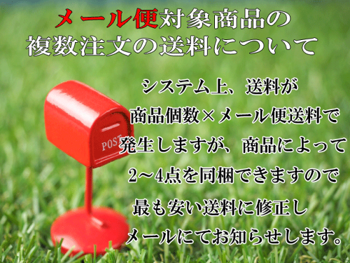 【メール便対象商品における複数注文の送料について】 ・システム上、「商品個数」×「メール便送料(190円または250円)」で送料が発生しますが、商品によって2〜4点まで同梱できますので、最もお安い送料に修正し、メールにてお知らせいたします。